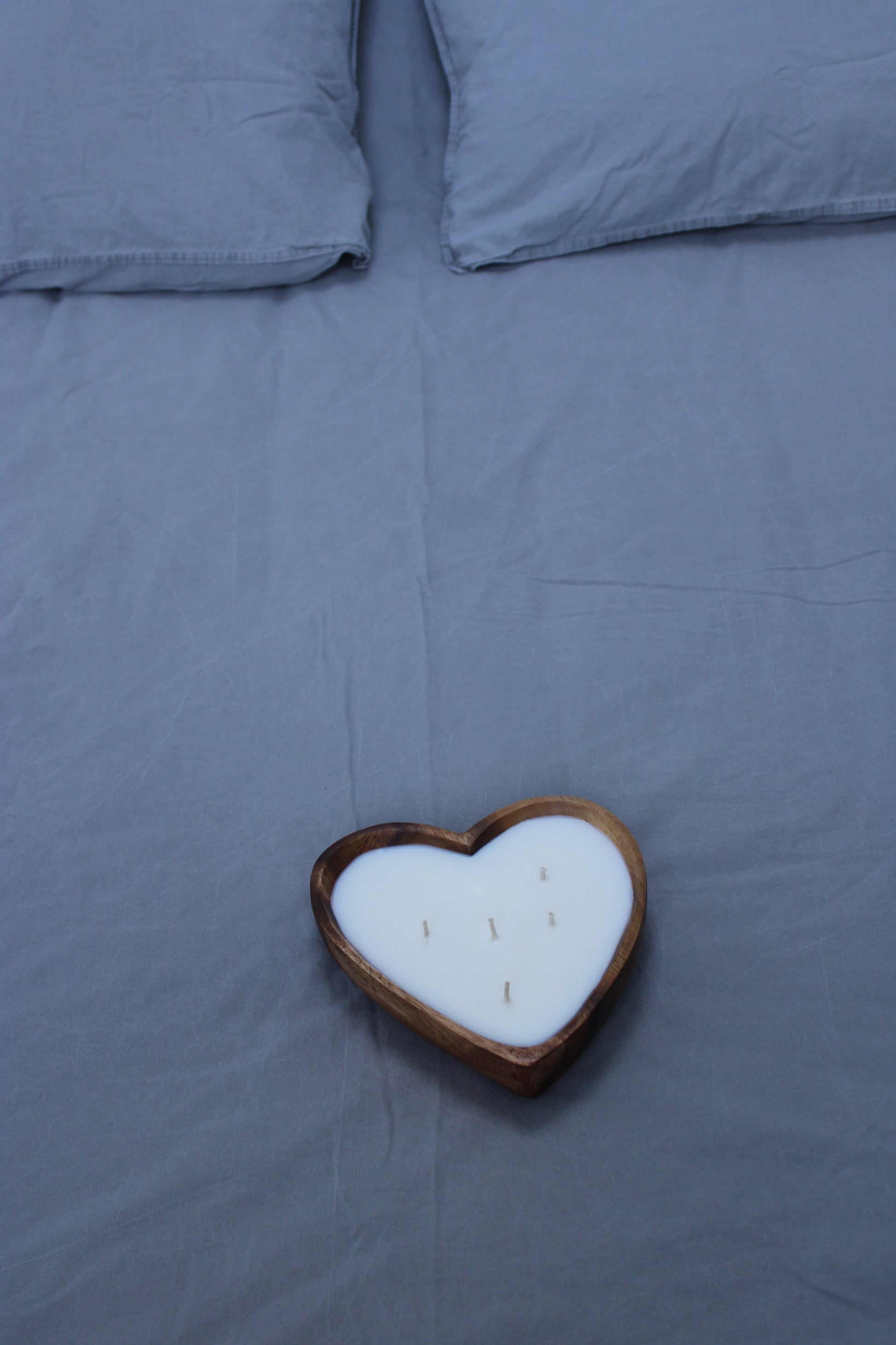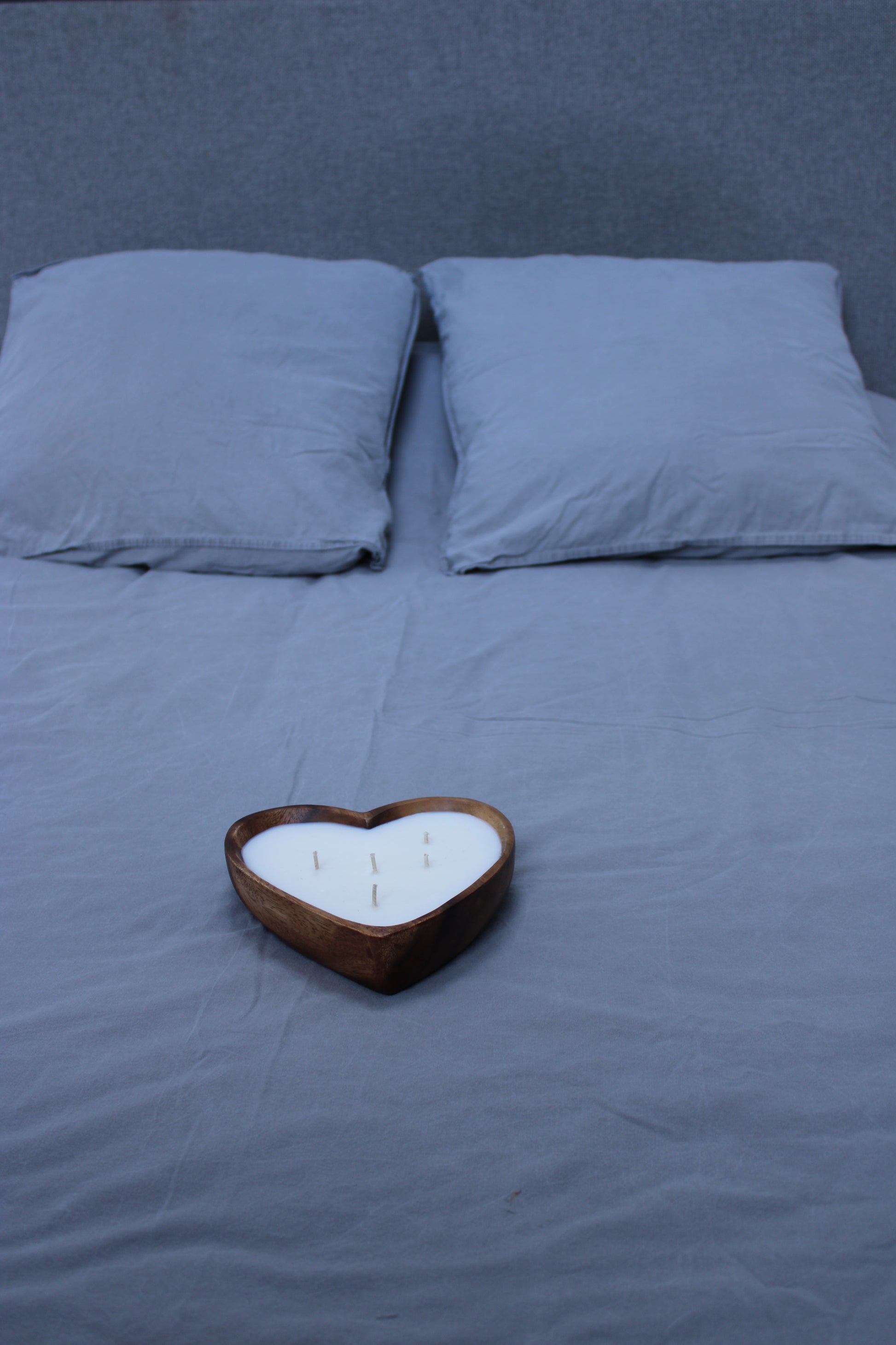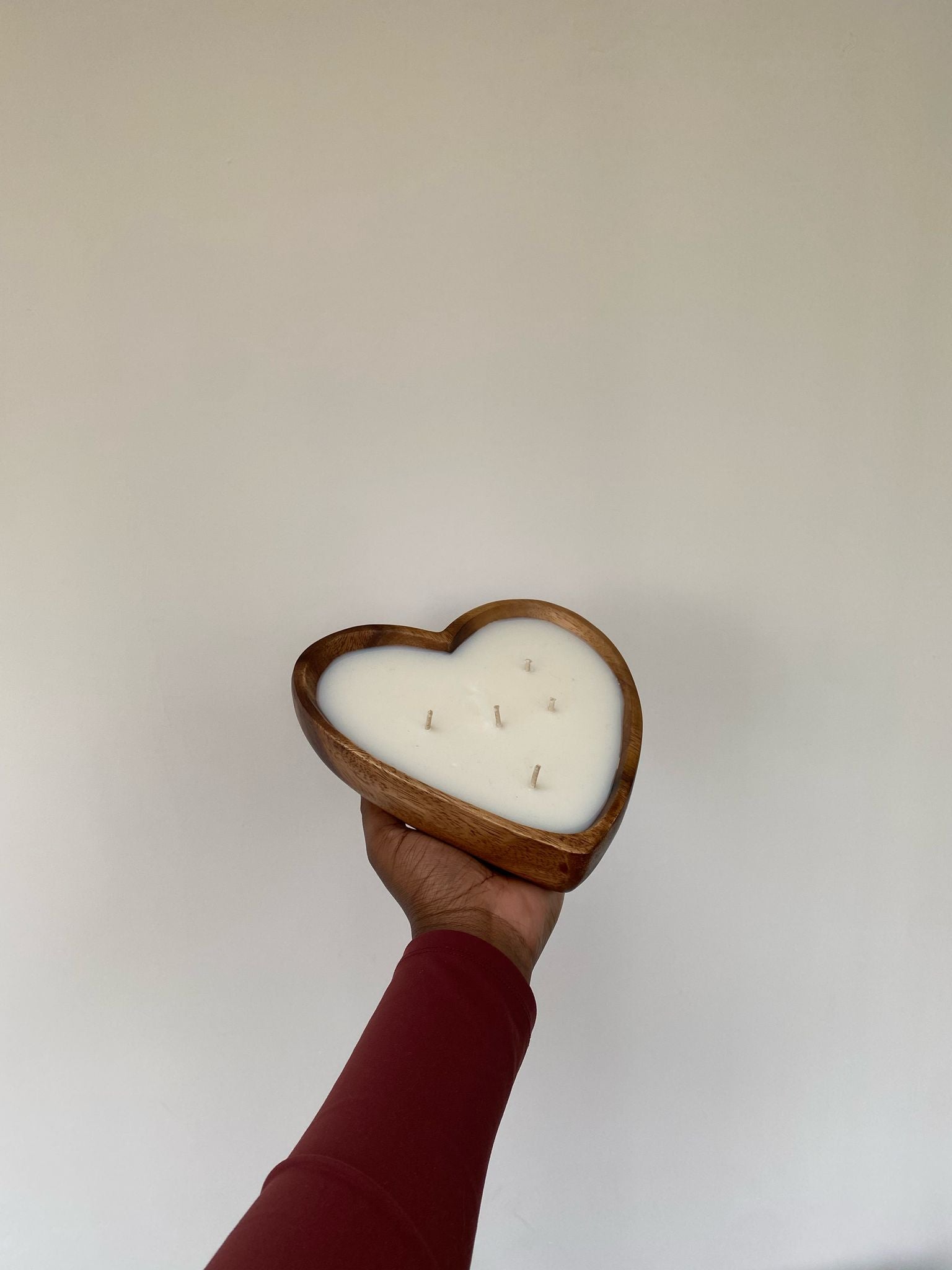 La bougie AYA de 5 mèches est coulée dans un contenant artisanal en bois d'acacia.