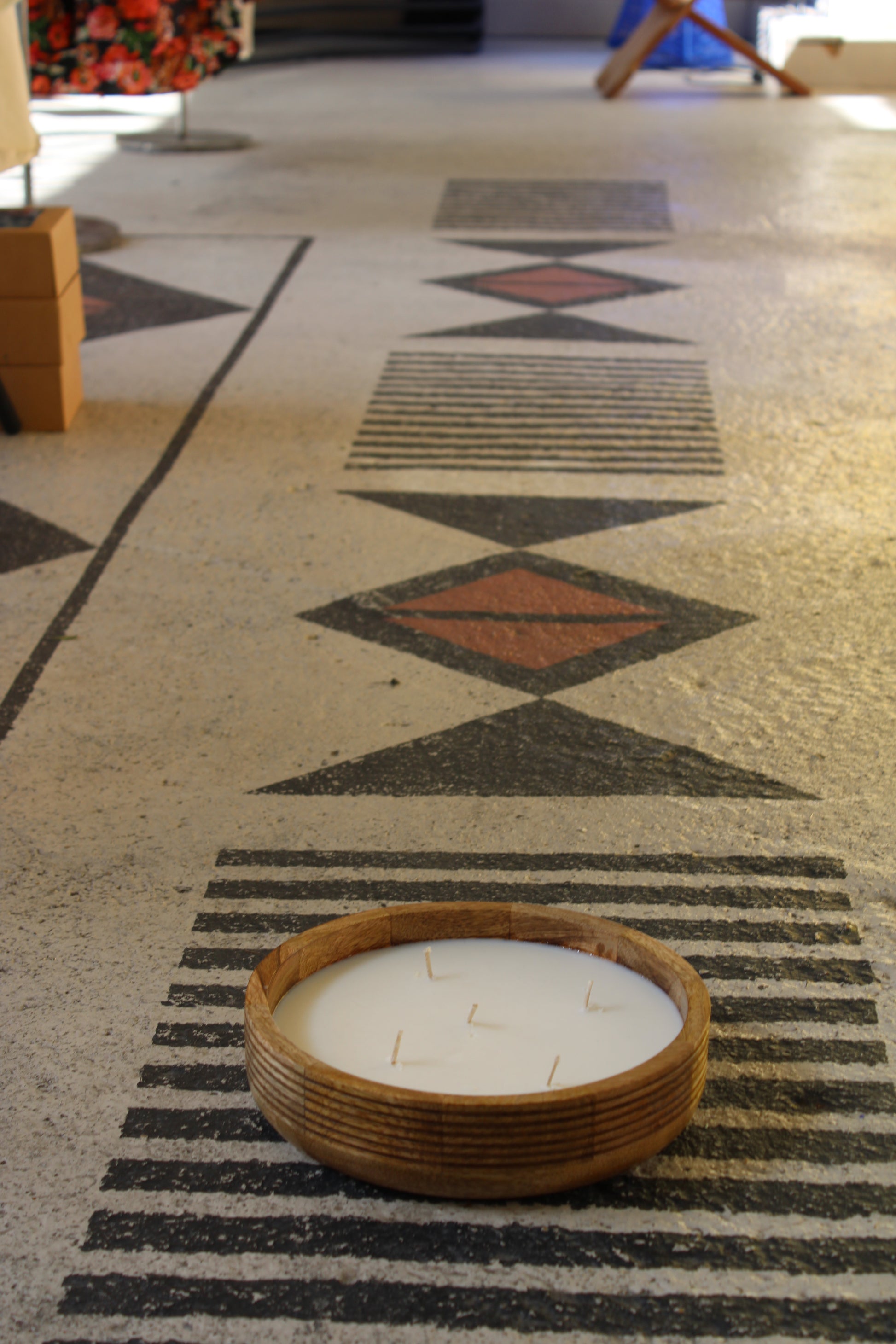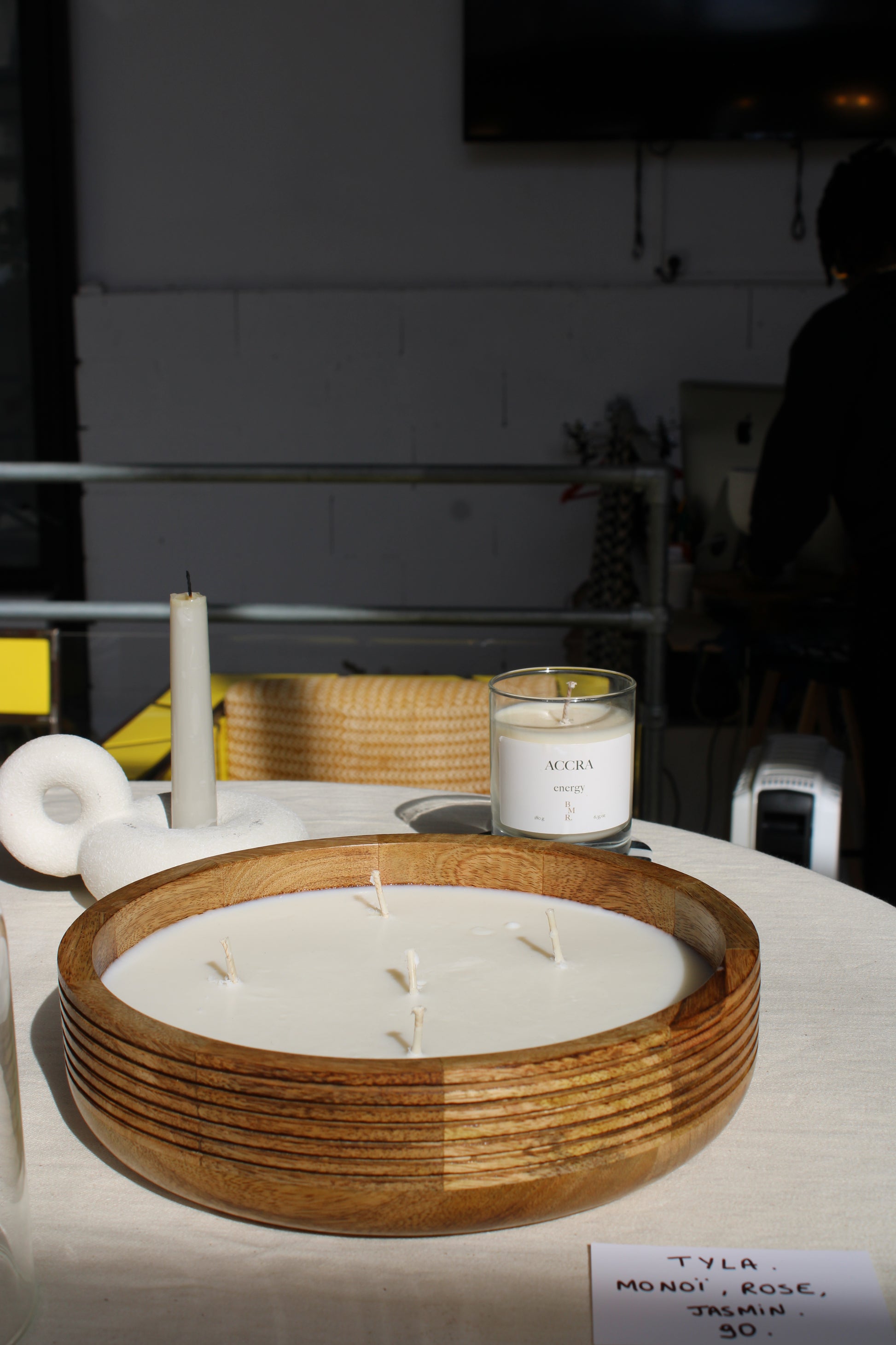 La bougie TIWA de 5 mèches vient dans un contenant artisanal en bois de manguier.